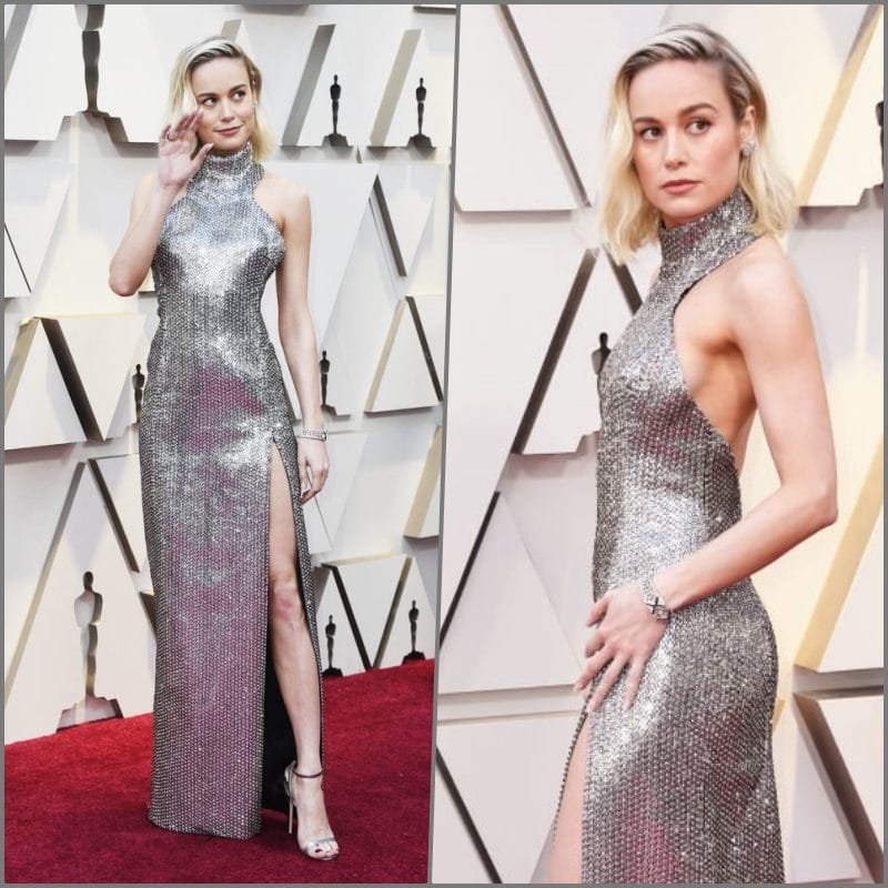 Silver sequins present as gray when they’re busy not reflecting—see Larson’s dress.