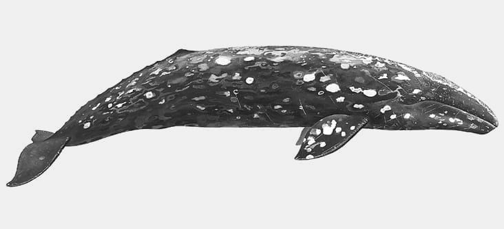 From afar, Gray whales are kind of like the Dalmations of the sea, their skin often dotted with patches of up to 400 pounds worth of white barnacles and sea lice.
