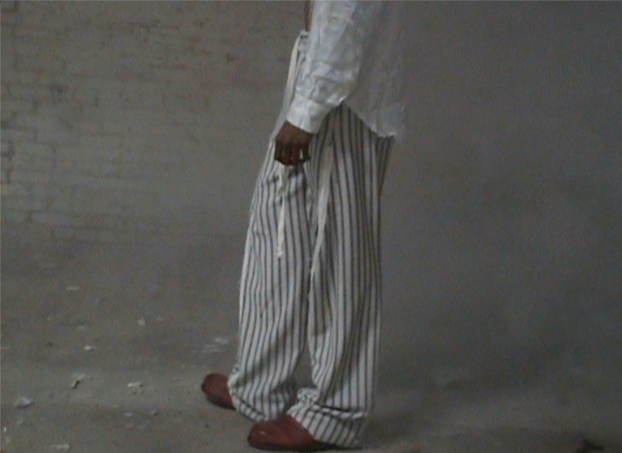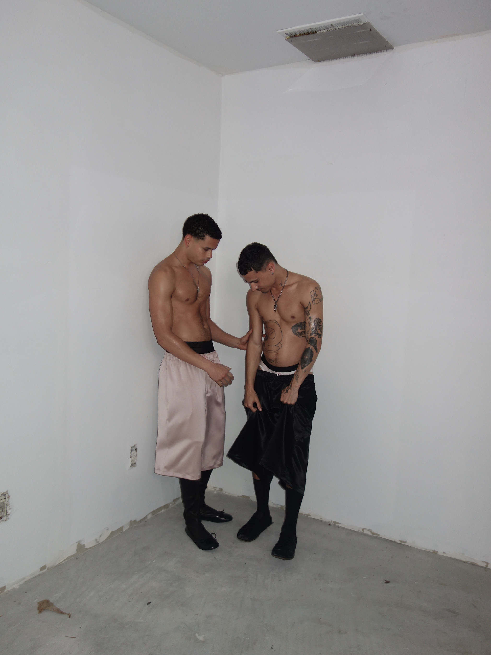 Note the subtle lace band on these Edward Cuming pants, which elevates the pinstripes with a winky sensuality. And the luxe sheen of baggy shorts from ABRA (paired with the brand’s boots and ballet flats juxtapose a soft gentility with hard silhouettes.